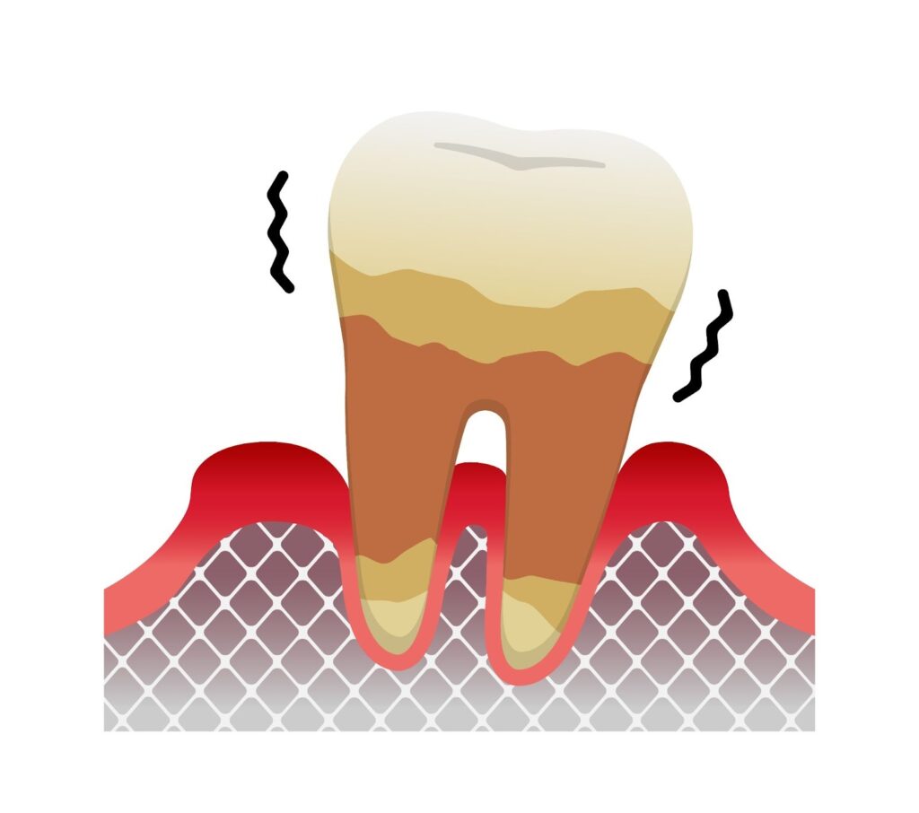 骨が減っているので歯が大幅に揺れだします。歯肉がだんだん下がってくるので歯根が見えてくることもあります。